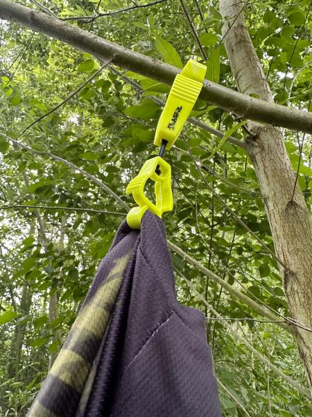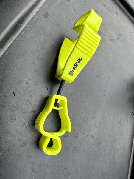 All-round retaining tool for storing and hanging essential items of equipment on a peg or in a boat. Two flexible retaining clips allow various items of equipment to be affixed and hung up to keep your peg tidy. Perfect for hanging lamps in a tent or on a peg, for drying gloves on a boat, etc.