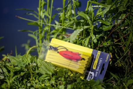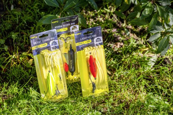 Waller Spezial ready-made leader from Stefan Seuß. The Worm River Rig is a veritable godfather when it comes to presenting natural baits just off the bottom in flowing water. Directly above the bait is a freely moving Winged U-Float that rotates in the current, creating highly attractive swirling directly above the bait. The bait is attached on two single hooks arranged one behind the other. To minimise the weight of the bait and ensure buoyancy, even with a large bunch of worms on the hook, there is an additional small floating device between the two treble hooks.