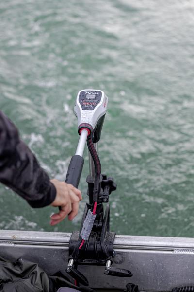 Powerful electric outboard motor with 70lb of thrust at a voltage of 12V. Corresponds to roughly 2 H.P. Maintenance-free design, since no graphite brushes are used as collectors. The so-called S mode (which is activated via the Sport Mode button) brings the motor to maximum performance directly however, it is also possible to use the Vario Speed feature to adjust the speed continuously in forward or reverse. When the motor is running, the display shows the battery condition. The motor also features a USB connector for charging phones or lamps. The tiller is extractable its shaft is made of stainless steel. It folds up by means of a lever. Both the propeller depth in the water and the steering pressure are continuously adjustable. An essential piece of equipment for demanding boat anglers.